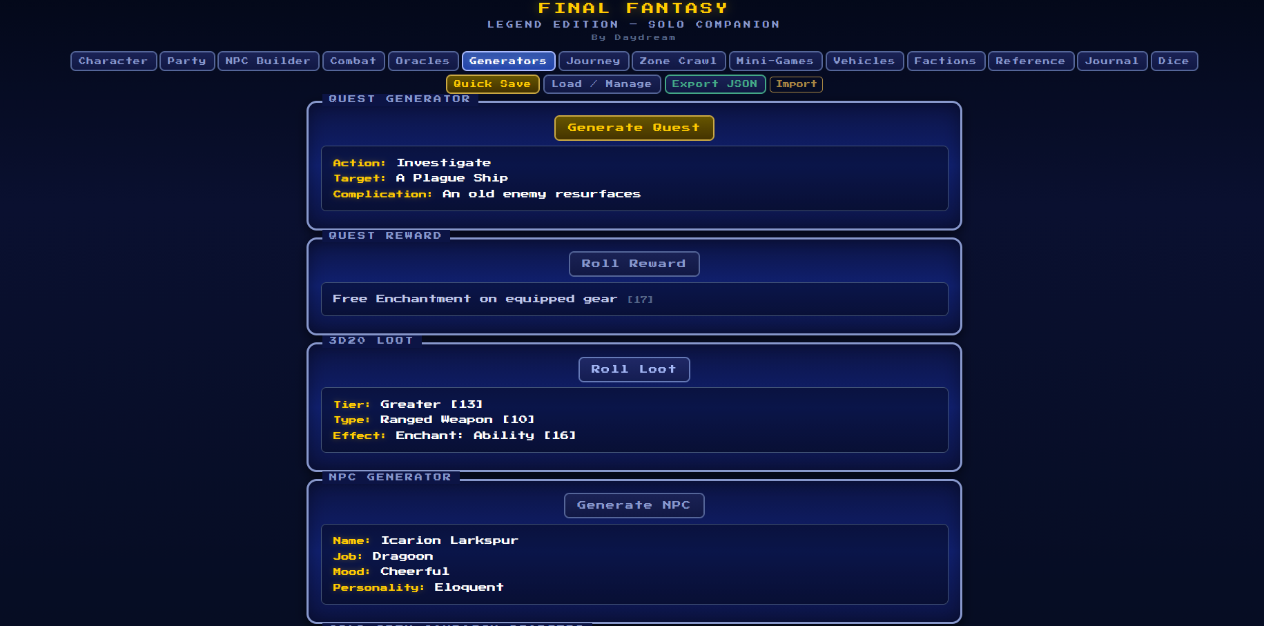 - Quest Generator, Name Generator, NPC Generator, Loot Generator, Cold-Open Campaign Start Generator